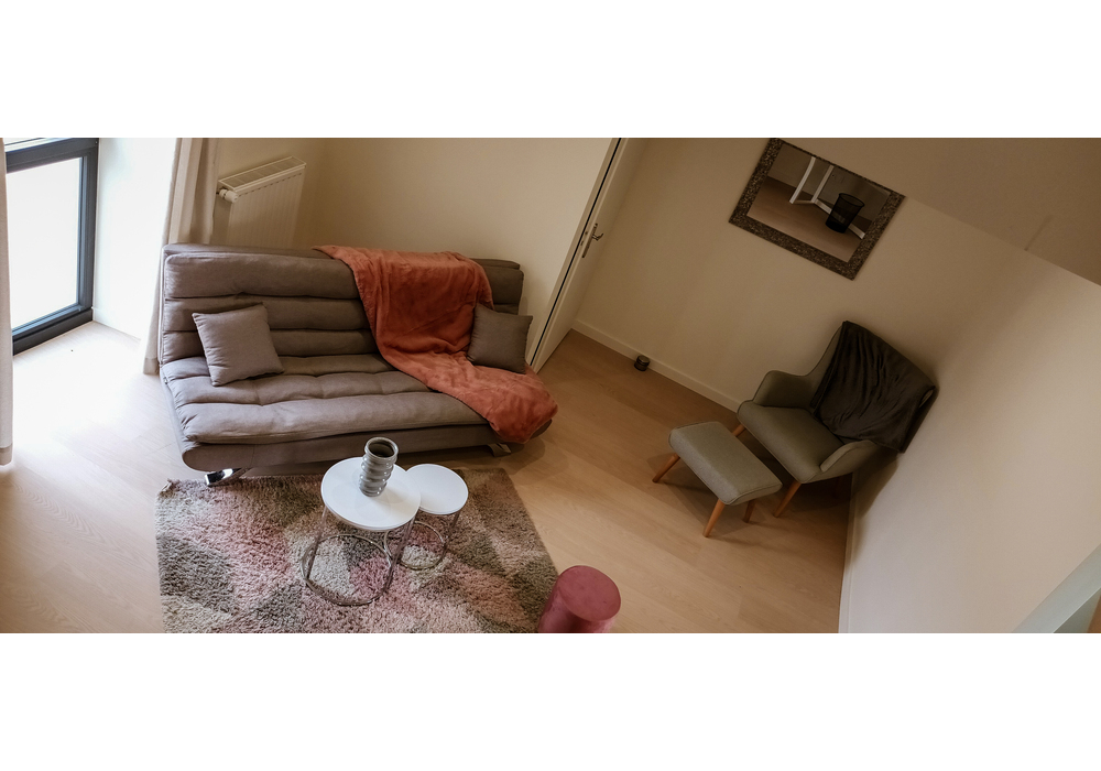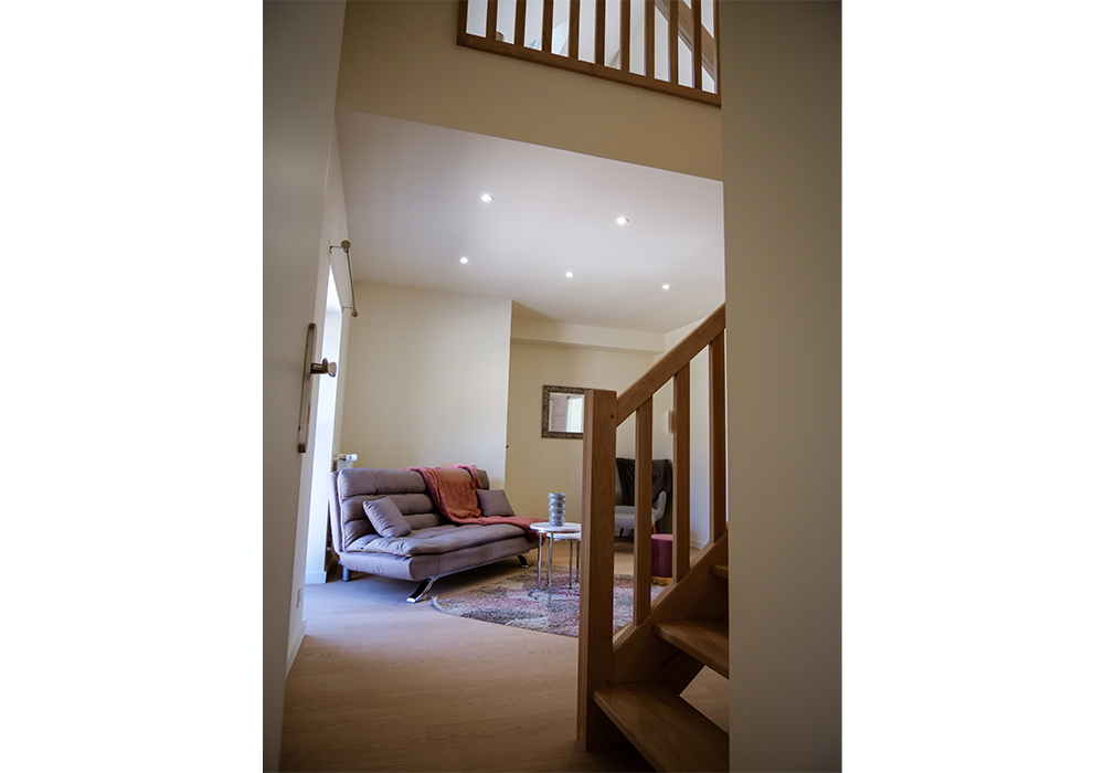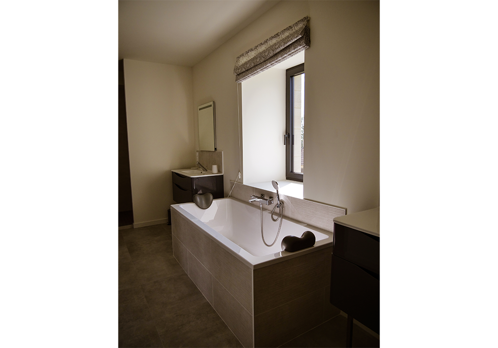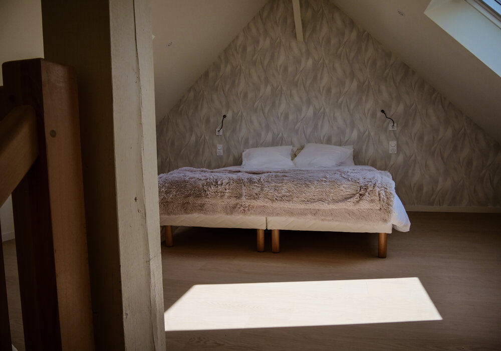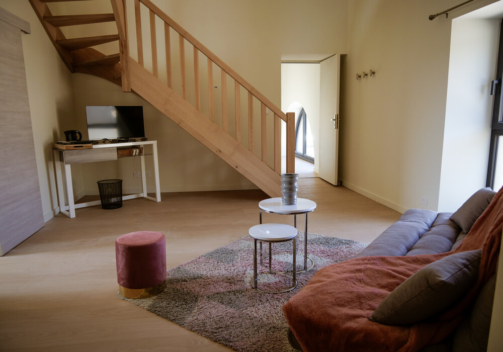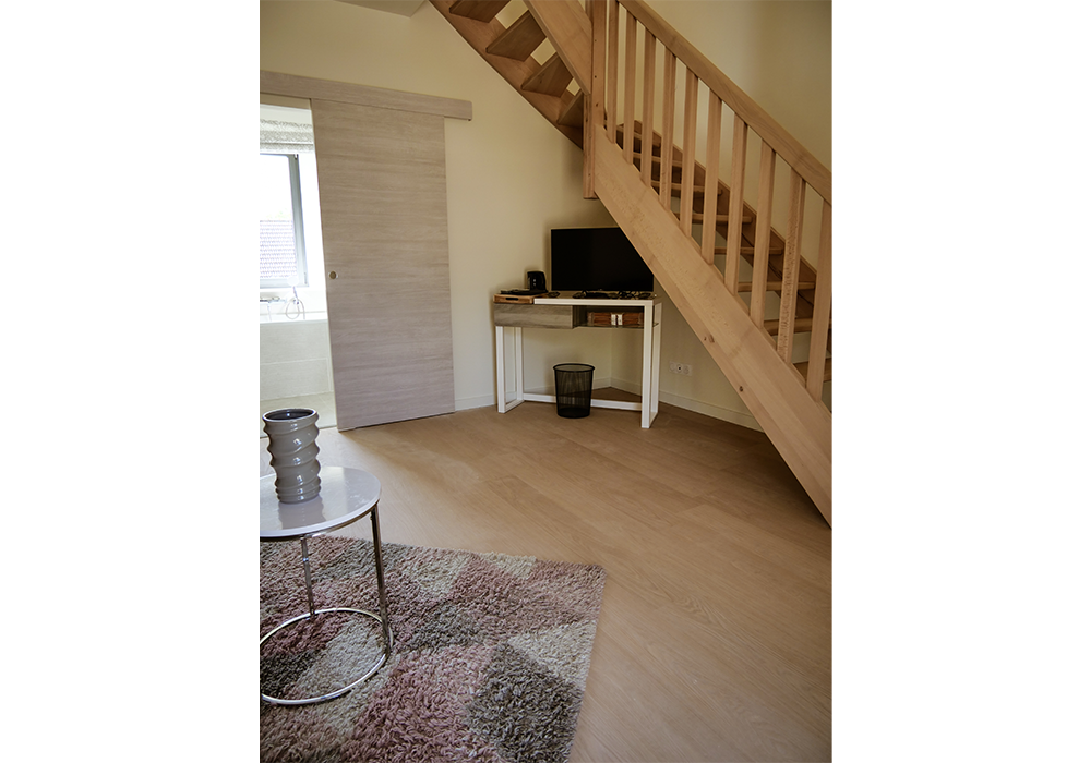 chambre pour 2 personnes composée d’un salon avec télévision et en mezzanine d’une chambre avec un lit king size de 180/200 (possibilité de les séparer en deux lits single), une salle de bain avec 2 vasques, douche et baignoire, un WC séparé.